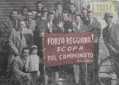 I giocatori della Reggiana presentati nella stagione 1956/57 con in sottofondo il nuovo grattacielo